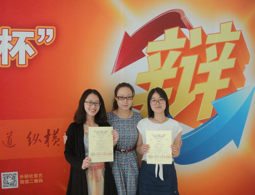 2015年5月18日-5月25日,由共青团中央、全国学联、北京外国语大学主办,外语教学与研究出版社、中国教育电视台承办的第18届“外研社·京东杯”全国大学生英语辩论赛全国总决赛在北京大兴外研社国际会议中心举行。我校英语学院辩手刘妍君、冯钰楚不负众望,经过8轮循环赛脱颖而出,闯入全国赛8强,最终夺得全国一等奖。英语学院谢雅姝老师应邀担任本次比赛的评委。